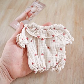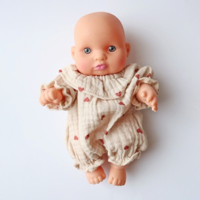 Cette barboteuse cousue artisanalement est un modèle unique : le tissu a été cousu avec le motif cœur orienté tête en bas.