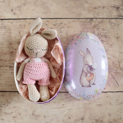Adorable lapin au crochet habillé d’une salopette rose prêt à être offert dans son joli œuf de Pâques.